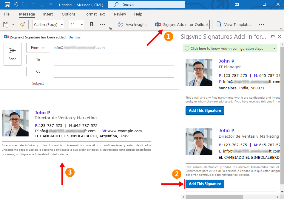 - In outlook, while composing email click on the 'Sigsync Addin for Outlook' option