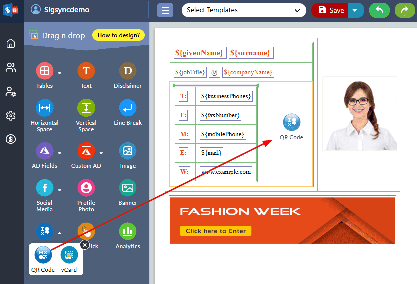 How do I dynamically insert vCard as QR Code along with an email signature?