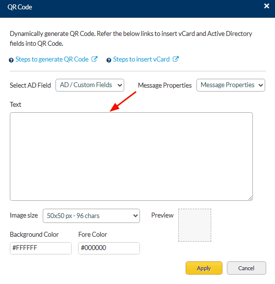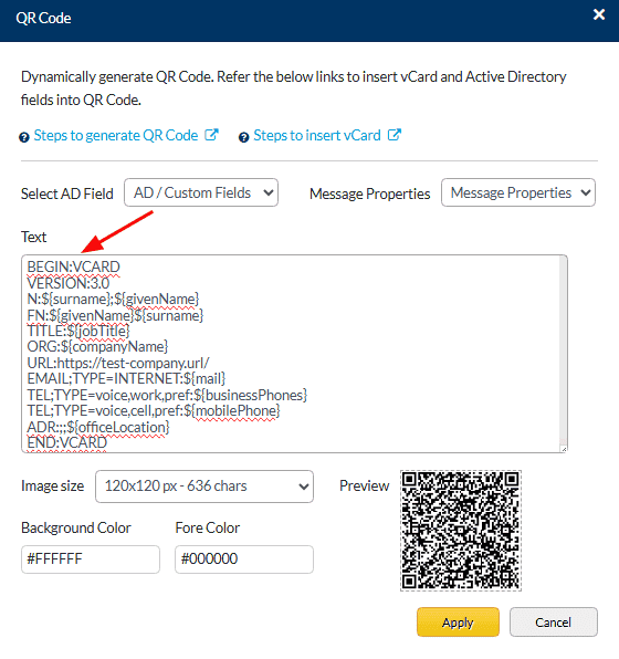 Sigsync enables you to dynamically insert vCard as QR Code in your signature. Open your vCard (.vcf) file on any text editor, copy the vCard details and paste them in the Sigsync QR code generating window. Replace the text part with the required Active Directory (AD) / custom AD fields.