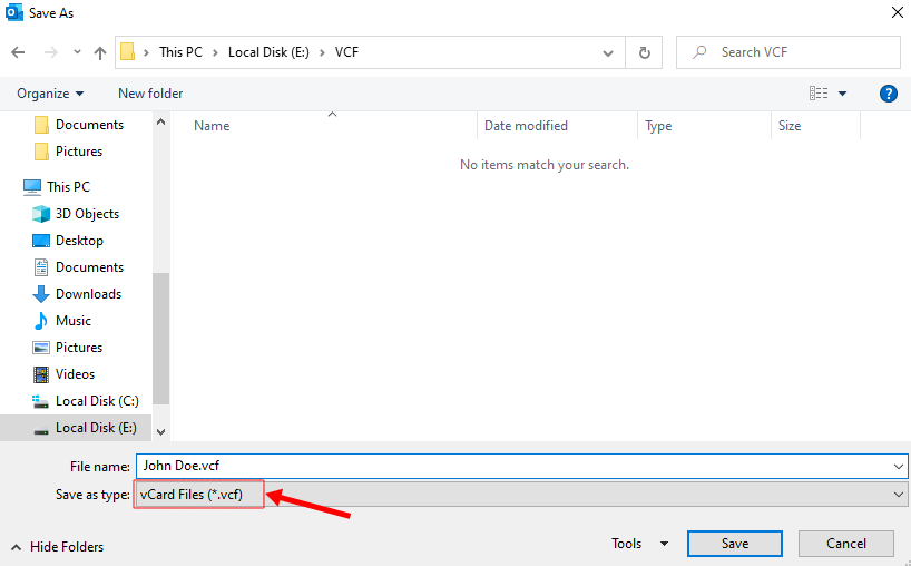 - Select the location to save the vCard. Ensure that the .vcf file extension is selected and click the 'Save' button.