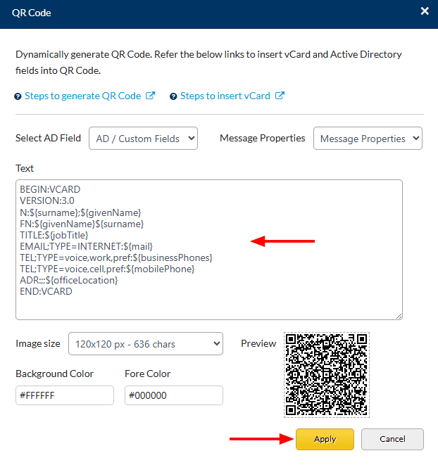 - Enter the vCard details. You can directly insert Custom AD Fields and Message Properties into the text field area. Finally, click the 'Apply' button.
