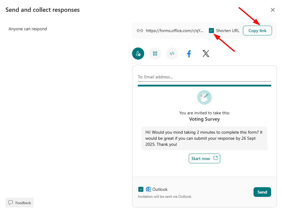 - For a short link, select the option 'Shorten URL' and click the 'Copy link' button.