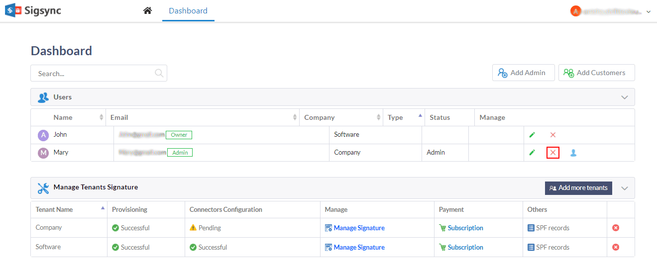 Delete all the admins from Sigsync Dashboard