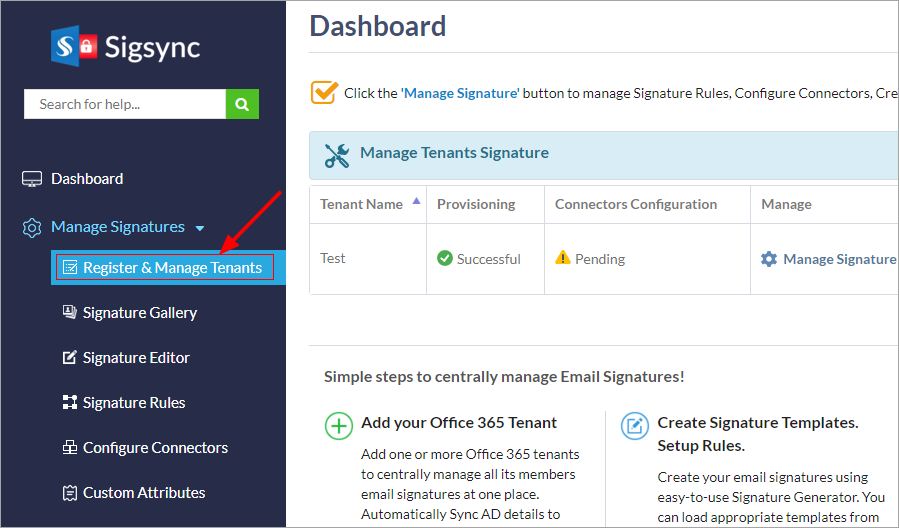 Our Support team will help you to reconfigure the Sigsync service for your tenant and Provisioning will be initiated. You can verify the Provisioning status in the Dashboard page under Provisioning. Provisioning may take a few minutes and the Provisioning status will change to Successful once the process is completed.