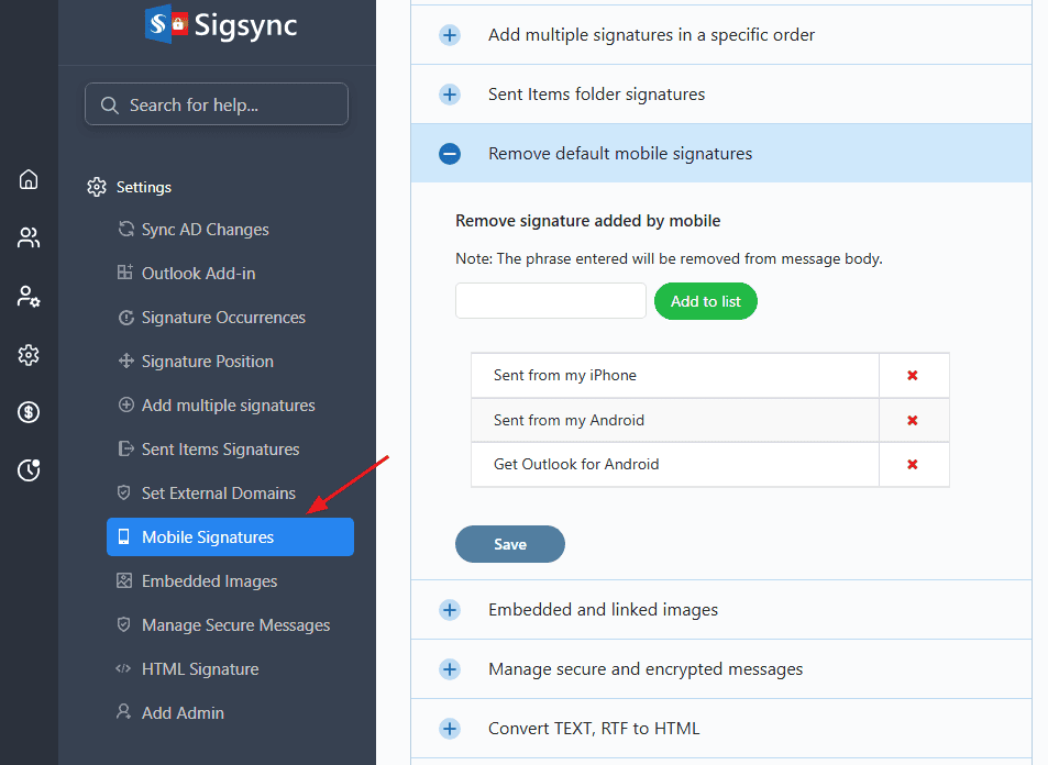 If you use mobile devices to send emails, it adds default email signatures (Example: Sent from my iPhone) and gets mixed with signatures added by Sigsync Email signature service. You would like to remove the mobile signatures.
