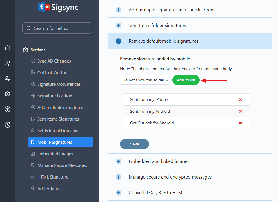 - Enter your signature phrase and click the ‘Add to list’ button to add it to the list of phrases to be removed.