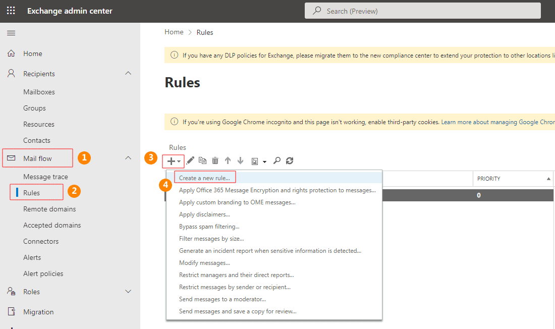 - Navigate to the Mail Flow tab and select Rules. Click the plus (+) icon and select Create a new rule.. option.