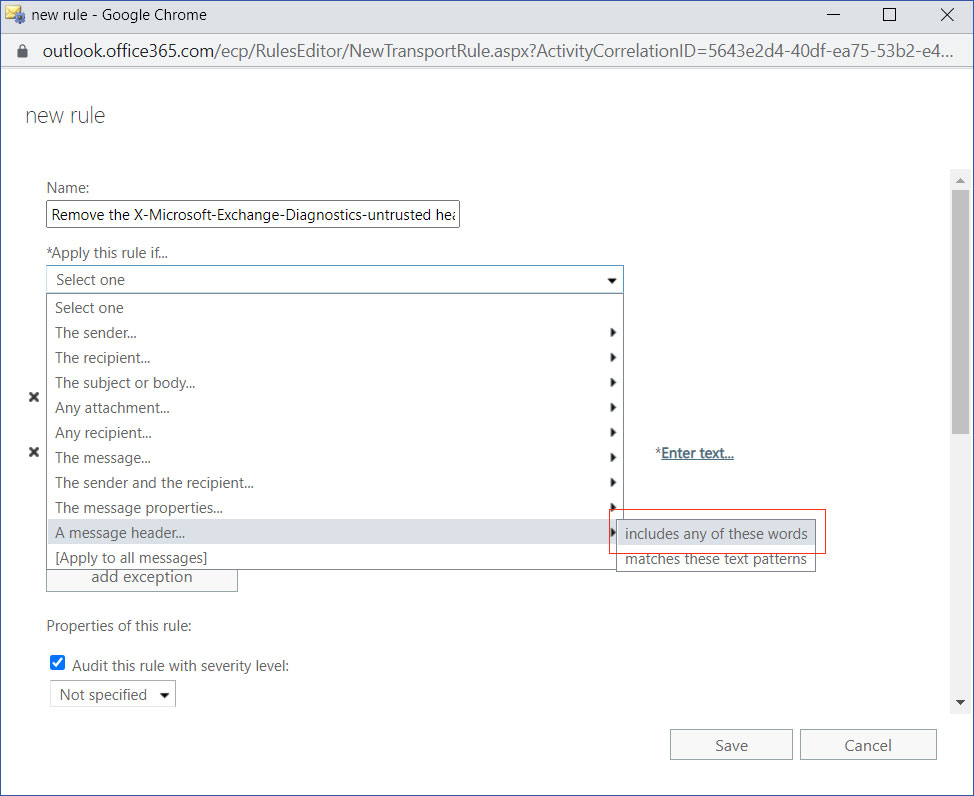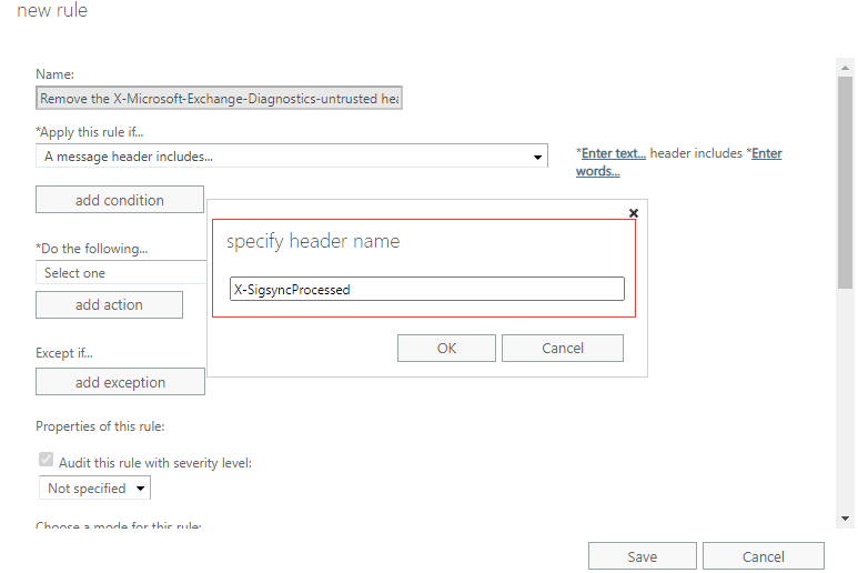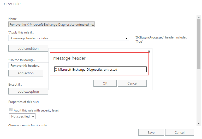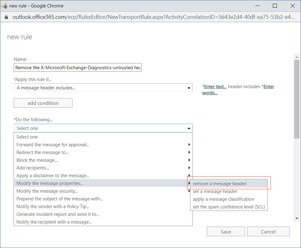 - Now add a new action under Do the following... by navigating to Modify the message properties… and select remove a message header. Enter the name of the header as X-Microsoft-Exchange-Diagnostics-untrusted. Keep all other fields as they are and click on the Save button to save the rule.