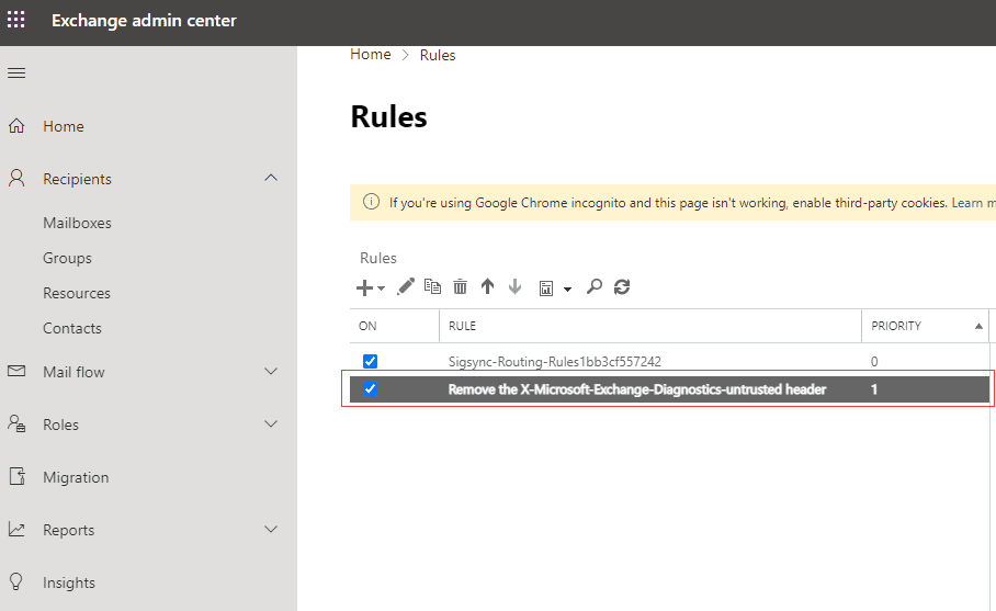 - The new rule will appear at the bottom of the list with the lowest priority. To position it directly below the Sigsync transport rule, move it up using the arrow button. By default, the Sigsync rule has a priority of 0, so set the new rule’s priority to 1. You can also edit the rule and adjust the priority manually if needed.