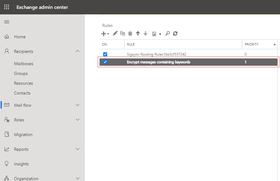 - Identify the transport rule in Exchange Online that manages the message encryption in your organization and double click on it.