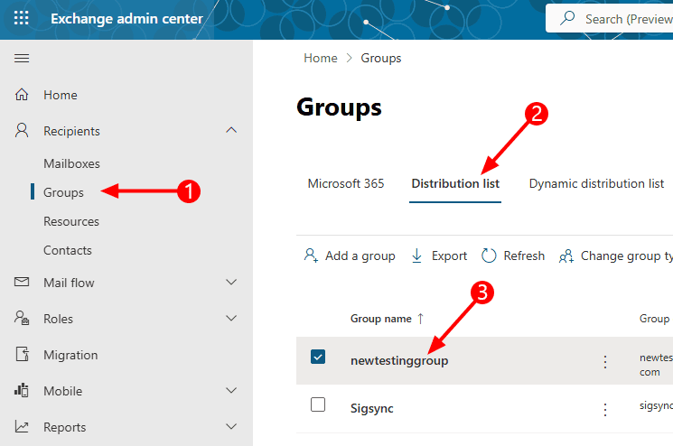 - Go to Recipients->Groups. Then click on the Distribution list tab and select the distribution group for which you need to enable the message approval.