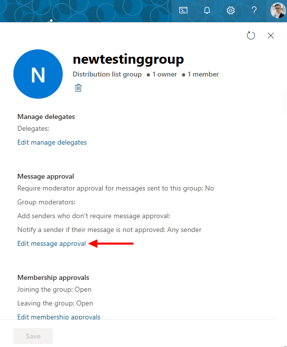 - For setting the configuration, double click on the particular distribution group that you have chosen. Go to the settings tab in the pane that opens and click the Edit message approval as shown.