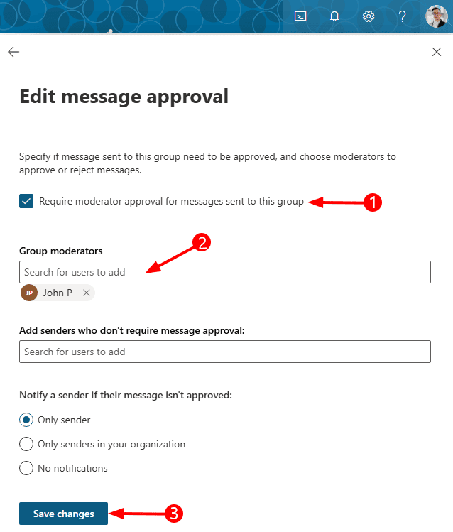 - After that, the Edit message approval pane appears. You need to select the check-box Require moderator approval for messages sent to this group. Then click on the Group moderators text box and you can search the user by typing their details or by choosing from the drop-down list that appears. Once you have added the user, save your setting by clicking the Save changes button.