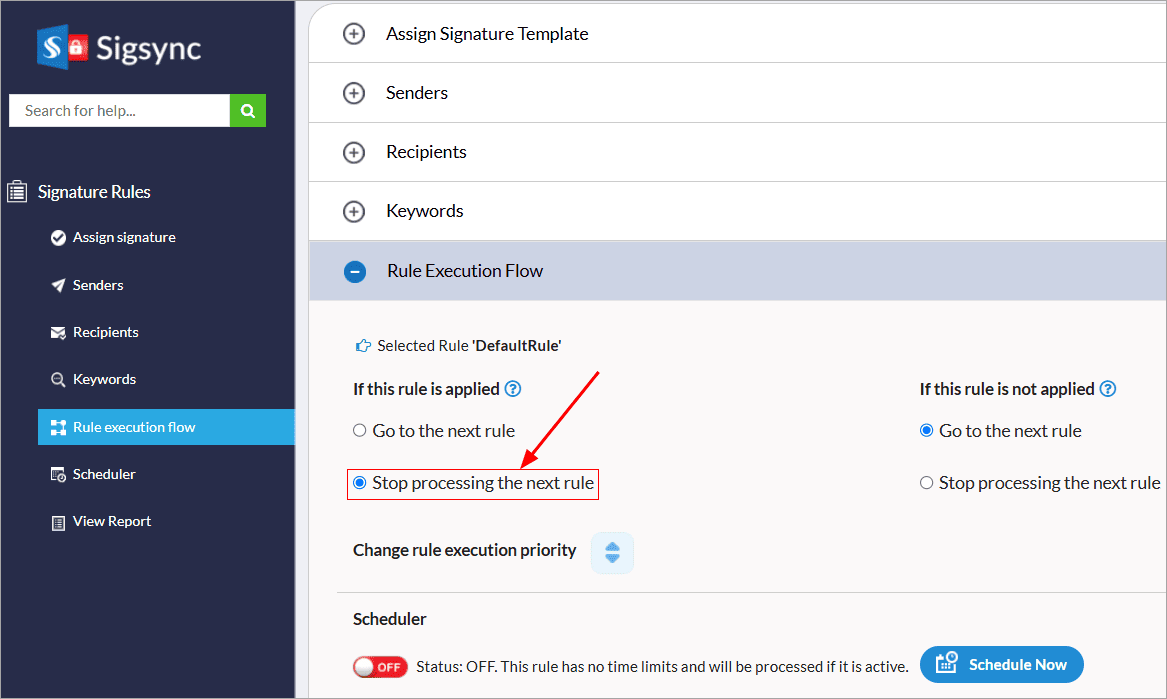 - Set Rule Execution Flow: If the selected rule is applied, then Stop processing the next rule.