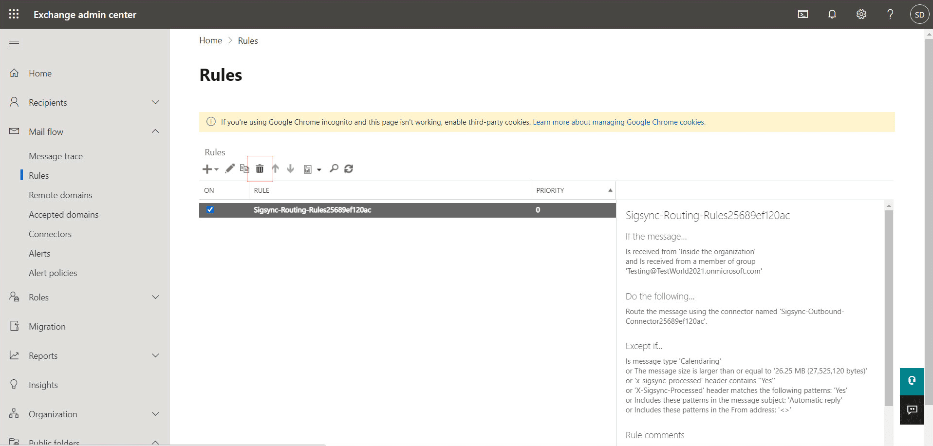 - Remove the Sigsync Exchange Transport rule. To do this, select the existing rule and click on delete (