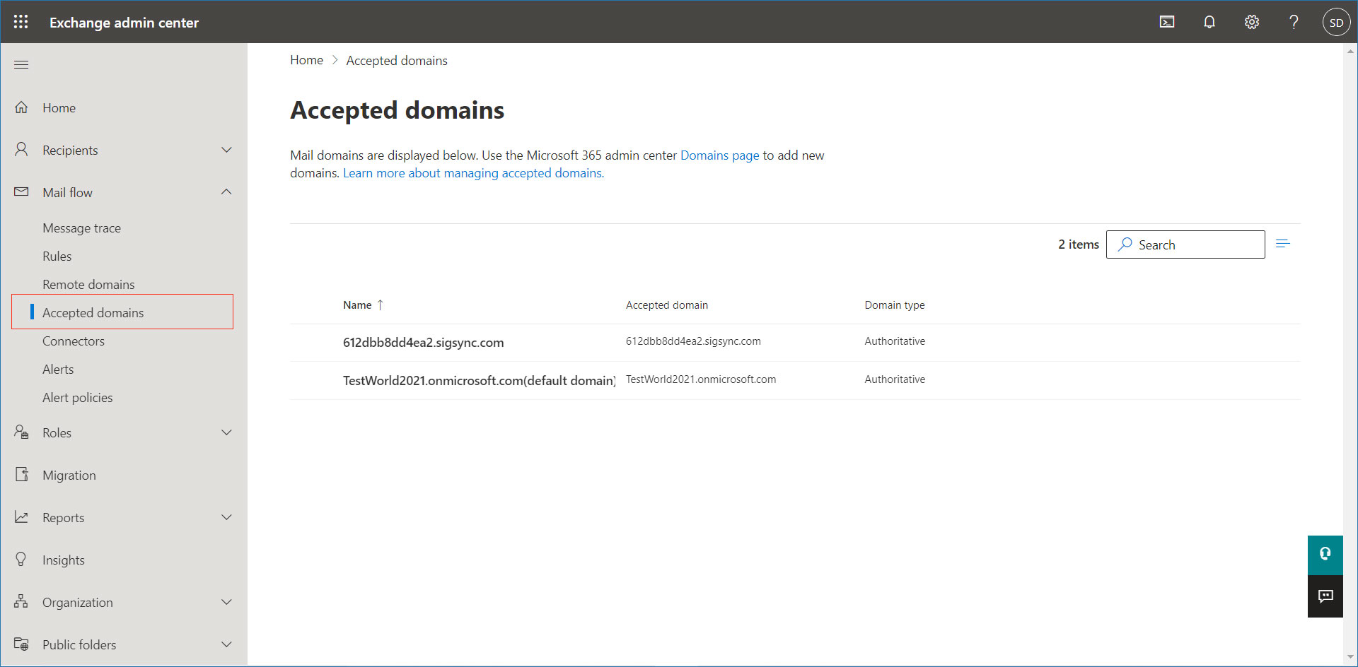 - Click on Mail Flow -> Accepted domains and check if the Sigsync domain is displayed on the list of accepted domains.