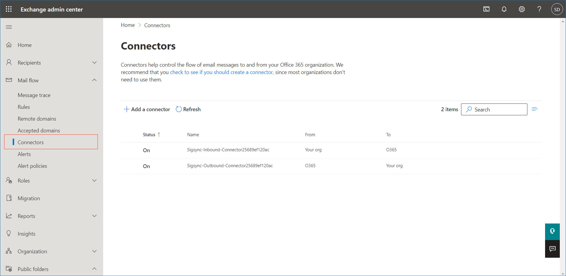 ) icon. - Then go to Mail flow and select Connectors, remove the Sigsync Inbound Connector and Sigsync Outbound Connector.