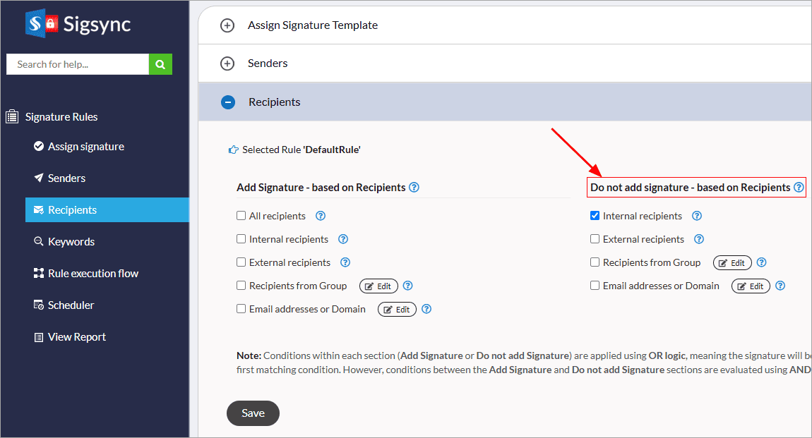 - Select the 'Recipients' tab and exclude the recipient by selecting the required option under Do not add signature - based on Recipients section.