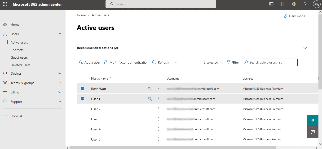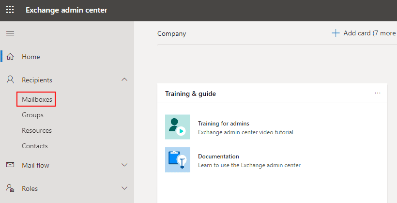 - Open Exchange admin center (EAC) and select Recipients -> Mailboxes.
