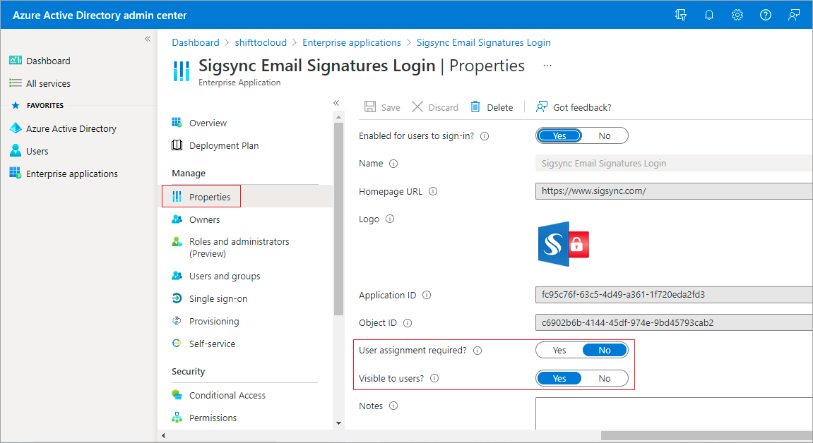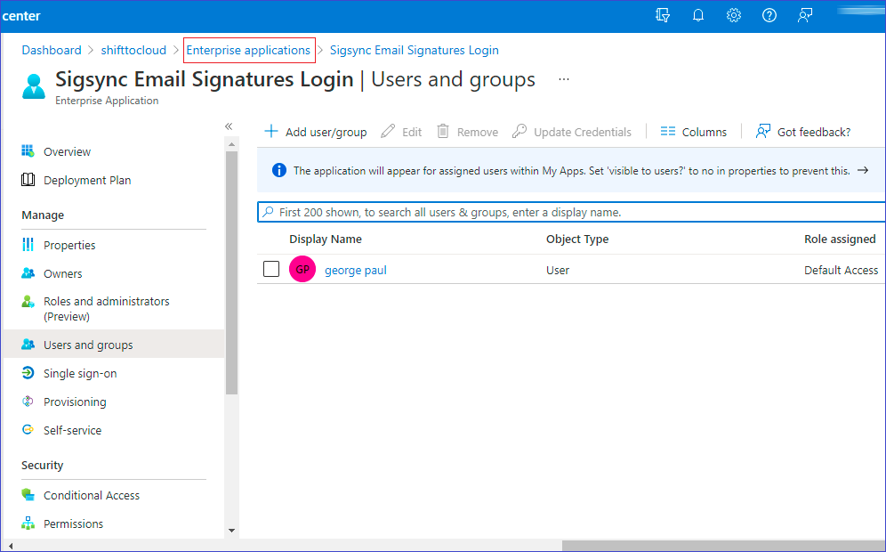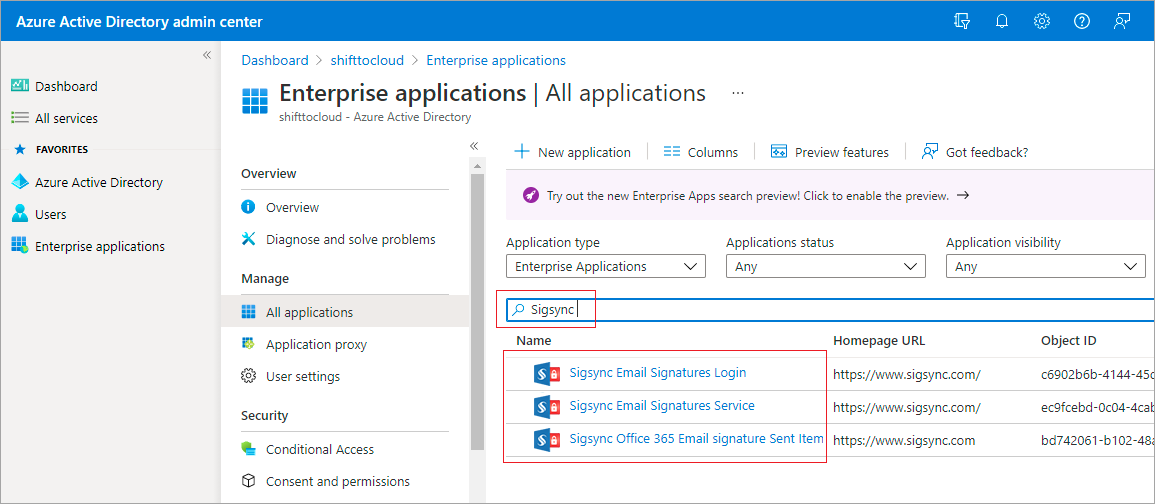 - Revert to the list of found Sigsync apps by clicking the Enterprise applications link at the top of the window.