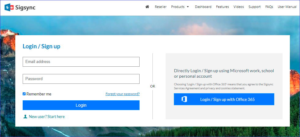 Note: If you use your Office 365 account email address for logging in with the Sigsync login method (LHS), then both the accounts will be merged and you will be able to log in to your account with either of the login methods.