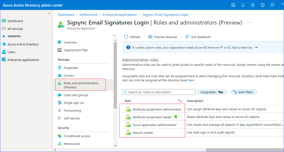 - Next, navigate to Roles and administrators in the menu under Manage. The following four entries should be present (Attribute Assignment administrator, Attribute Assignment reader, Cloud application administrator, Reports reader).