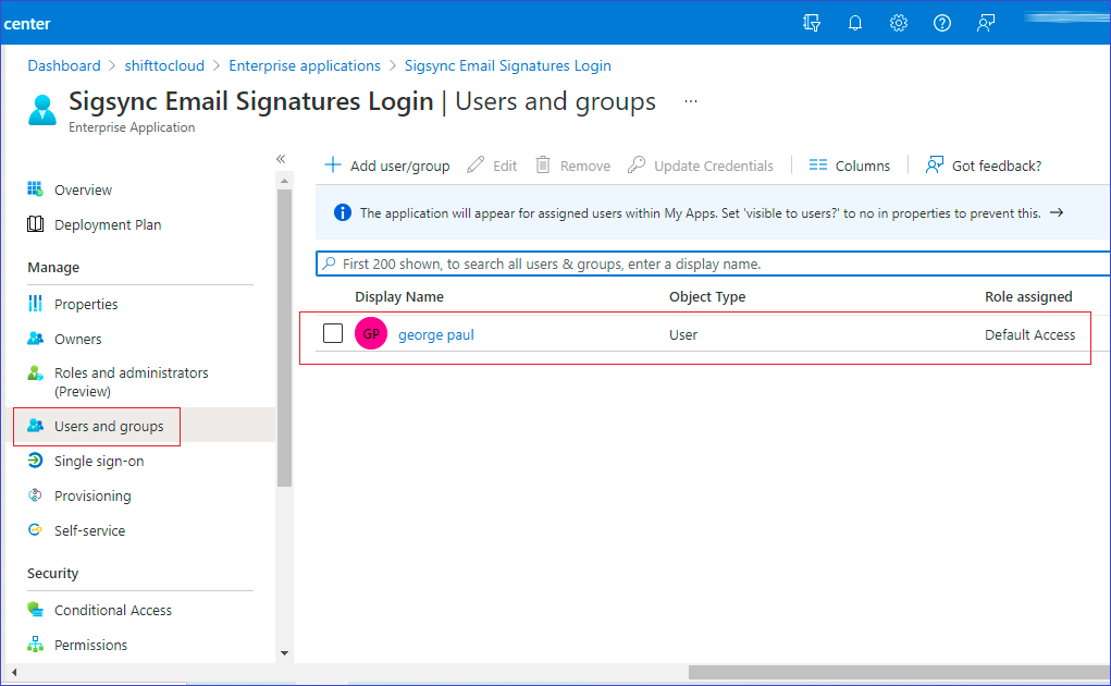 - Finally, navigate to Users and groups and verify if you can notice the entry for the admin account user with the Default Access role assigned as shown. If there is no such entry, add an admin account user by clicking +Add user/group, ideally the one used to register your tenant with Sigsync.