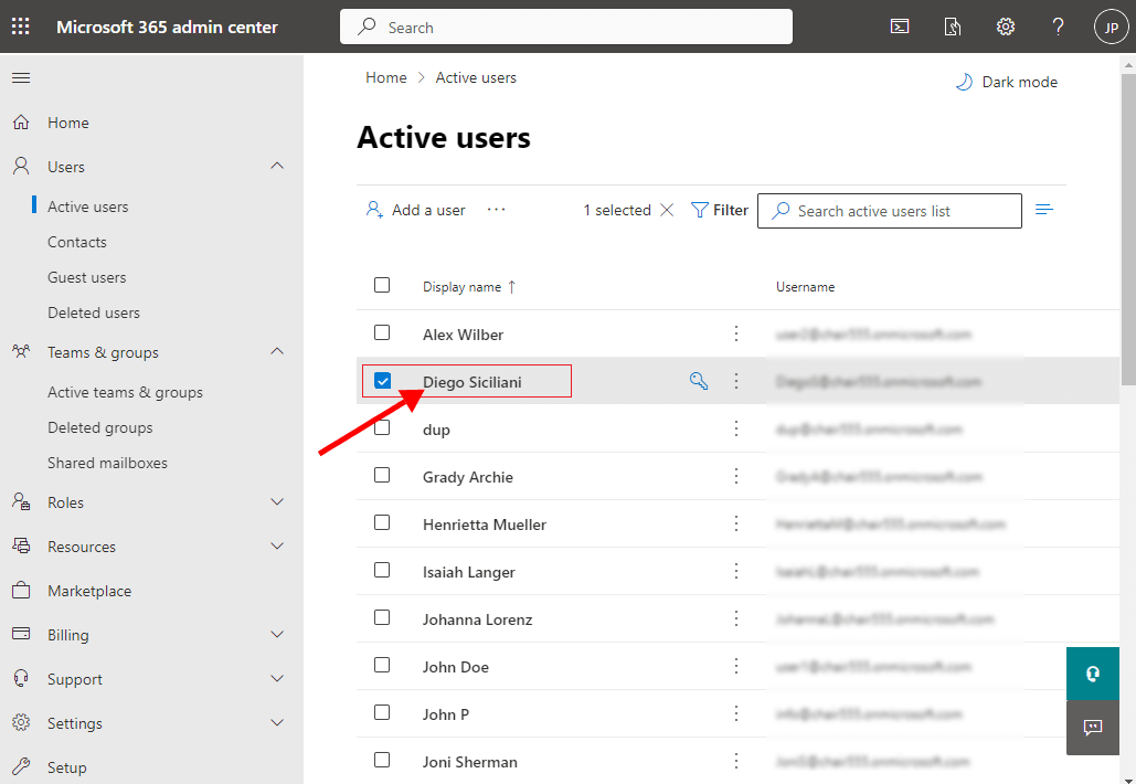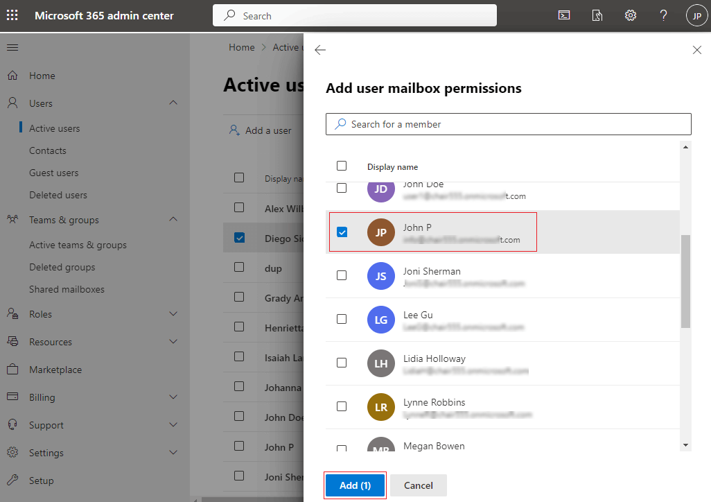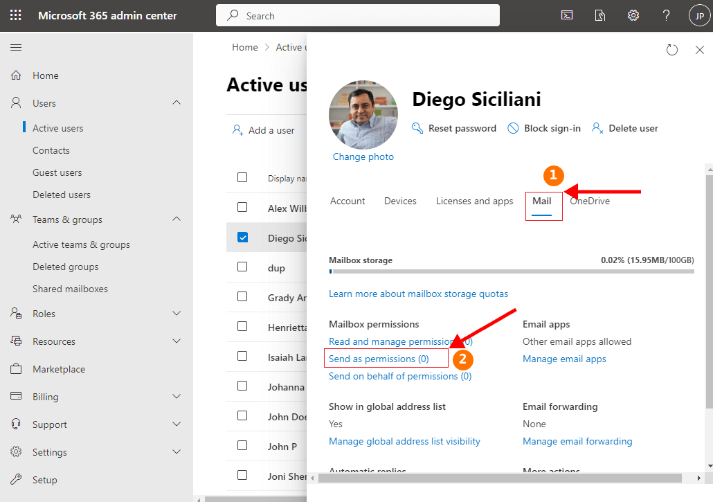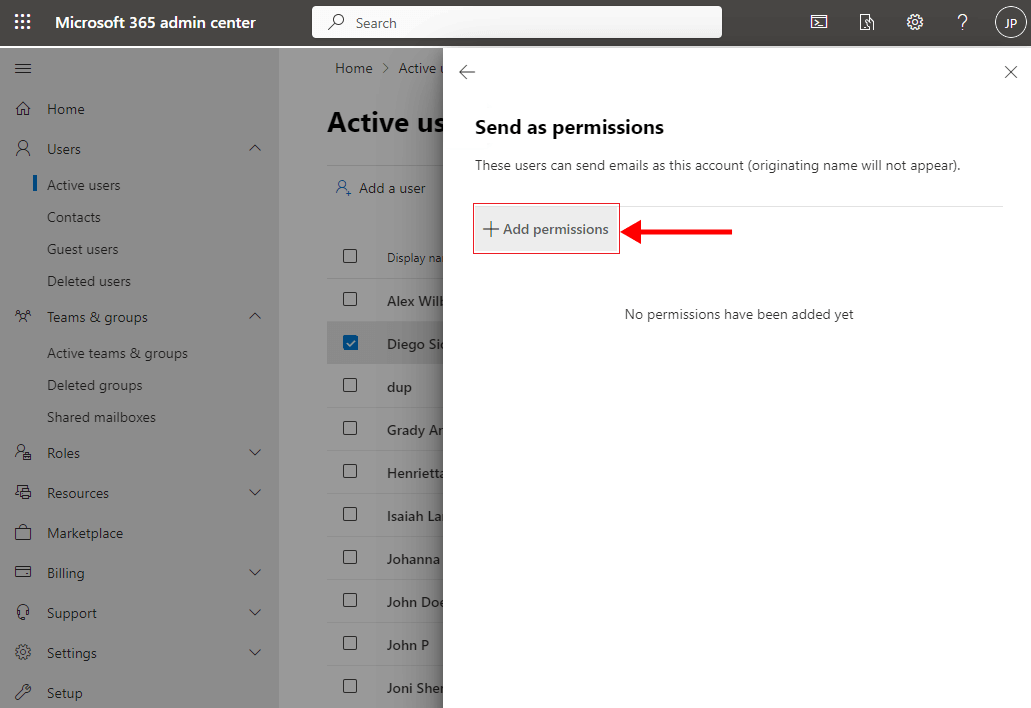 - Select the user (John P) to whom you want to set the permission to send emails as 'Diego Siciliani'