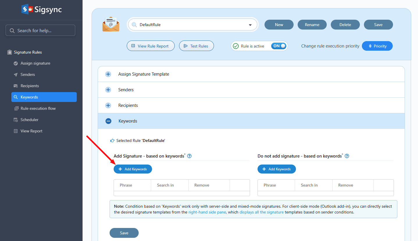 - Select the 'Keywords' tab and click the 'Add Keywords' button under ‘Add Signature – based on keywords’ section.