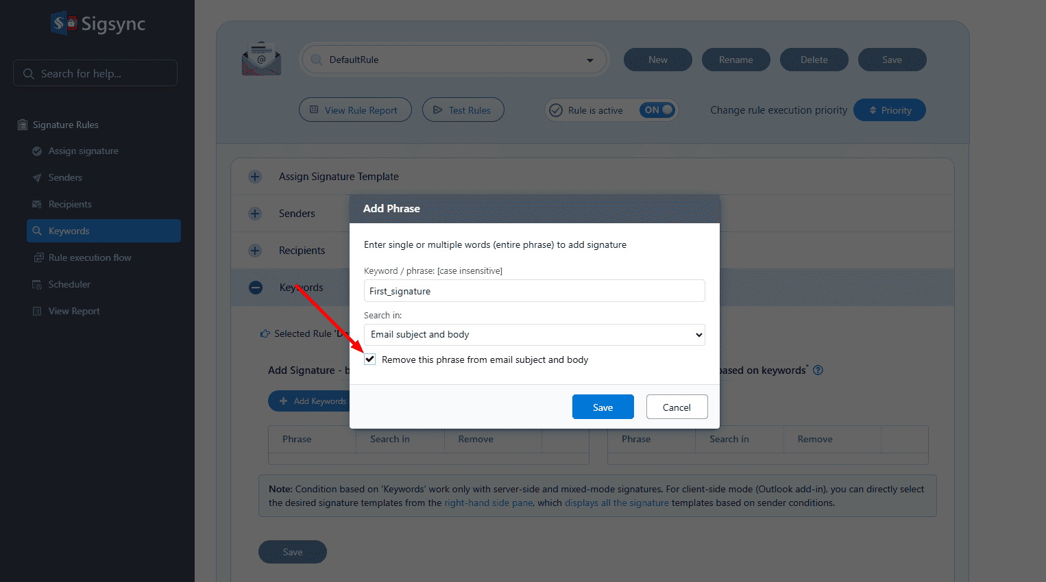 - Set the keyword (Ex: ‘First signature’) and select the 'Search in' option as either email body, subject or both. Check ‘Remove this phrase from email subject and body’ to remove the keyword from email after adding the signature. Click the ‘Save’ button
