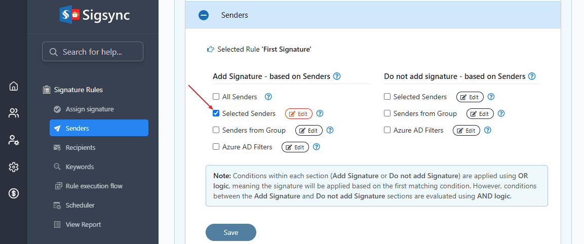 - Click the ‘Edit’ button next to ‘Selected Senders’ under the ‘Senders’ tab and select the sender to whom you want to set two signatures.