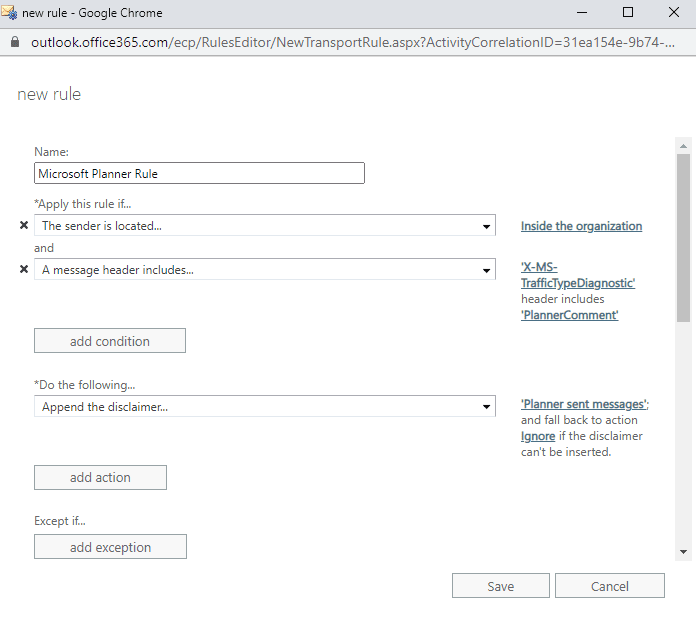 After creating the new rule, follow the steps below to define the conditions and actions for processing Planner messages:
