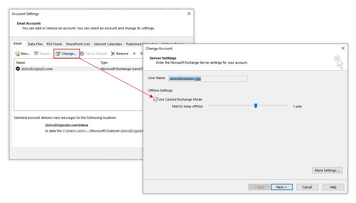 - Choose your email account and click Change on the Email tab. This will launch the Server Settings dialogue box as shown in the below screenshot. If the Mail to keep offline period is set to All (as shown in below screenshot) or is long enough to include all of your email correspondence, you will not see the View on Server button because all of your email correspondence will be kept offline.