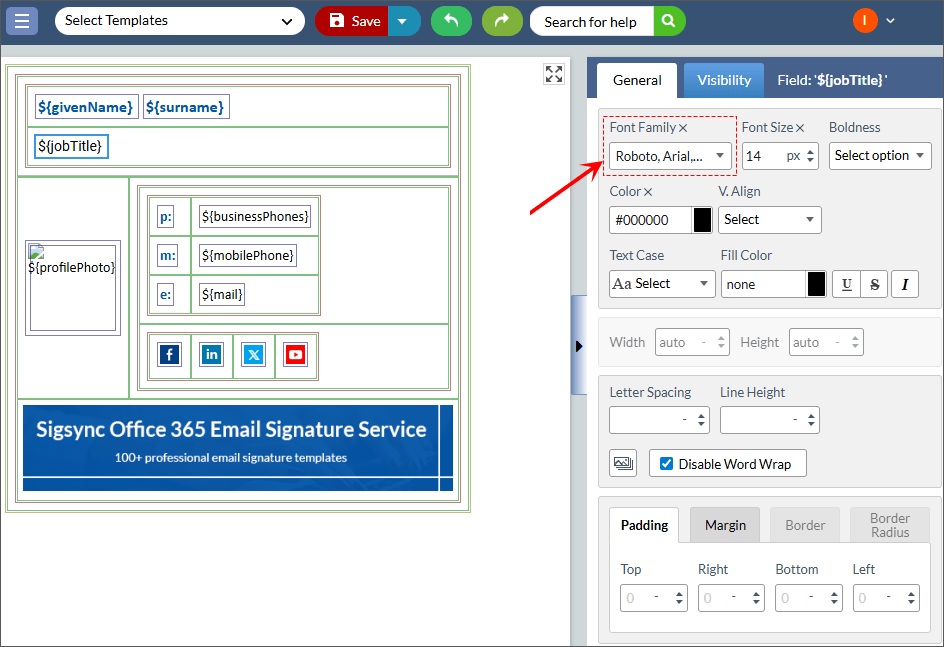 For example, as shown in the screenshot below, under the Custom Font Family option, the primary custom font used is 'Roboto', with 'Arial, sans-serif' as the fallback font. If a device does not support the 'Roboto' font, your signature template will automatically use the fallback font, 'Arial, sans-serif'
