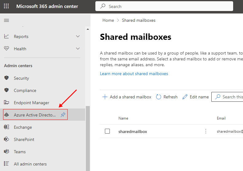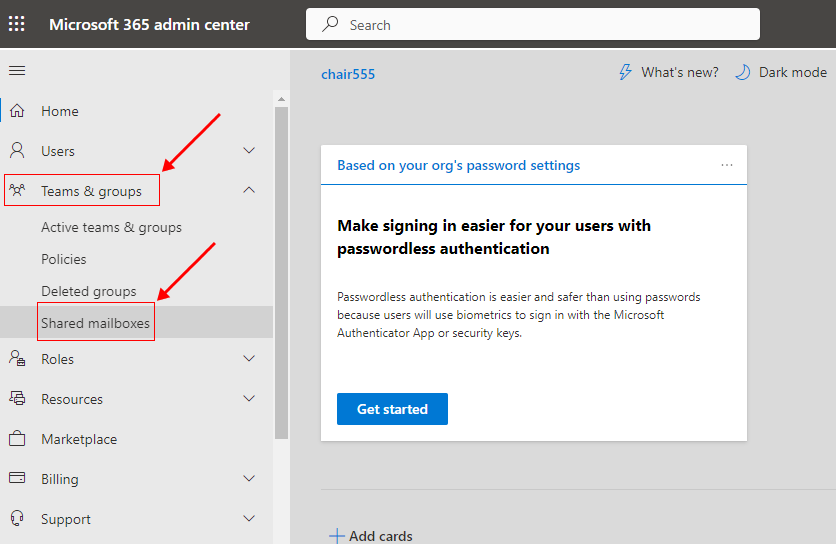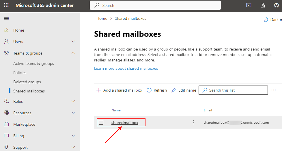 - Navigate to ‘Teams & groups’ > ‘Shared mailboxes’