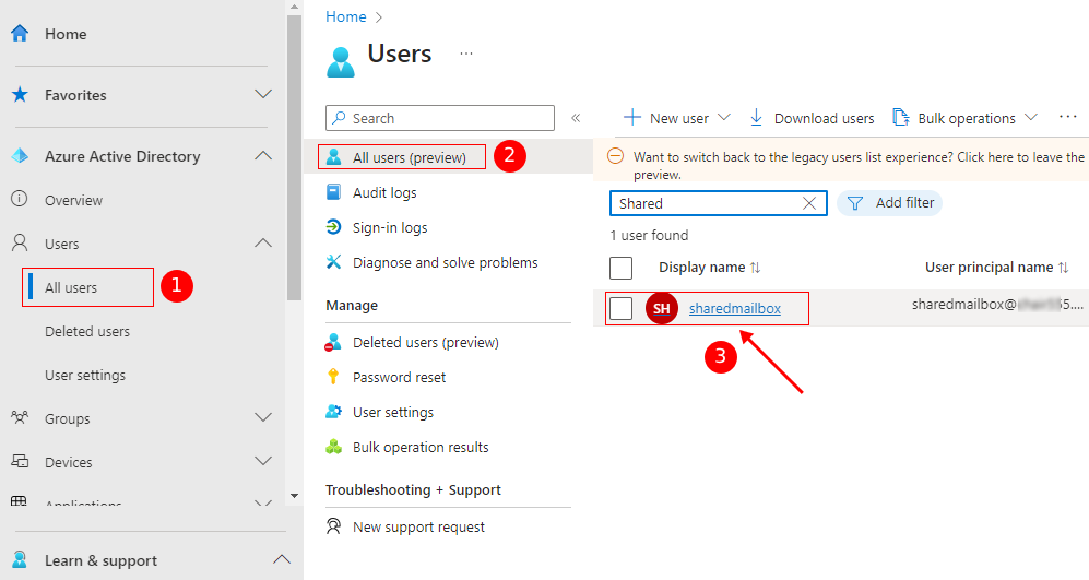 After setting delegate rights, create a new Active Directory profile for the Shared mailbox if it is not already available in your Azure Active Directory.