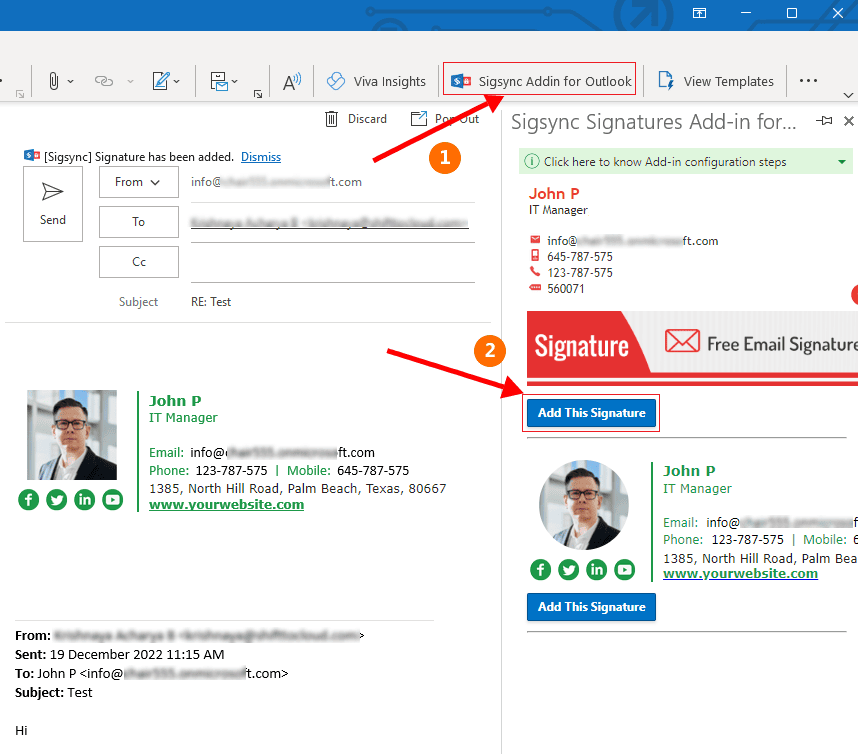 On client-side signature mode (Sigsync Outlook Add-in), there is no way to find if your email reply chain already has a signature template attached to it. As a result, Sigsync will automatically add the subsequent email signature template to your first reply because it is considered as a subsequent email even though you are replying for the first time. If you want a different signature for the first reply, we recommend you to select the first signature manually by clicking the 'Add This Signature' button from the Sigsync Signatures Add-in pane as shown in the following screenshot. For the subsequent emails after the first reply or forward, the signatures get applied automatically.