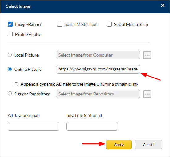- You can either load required images from your local drive or insert it using an image URL and click on ‘Apply’ button.