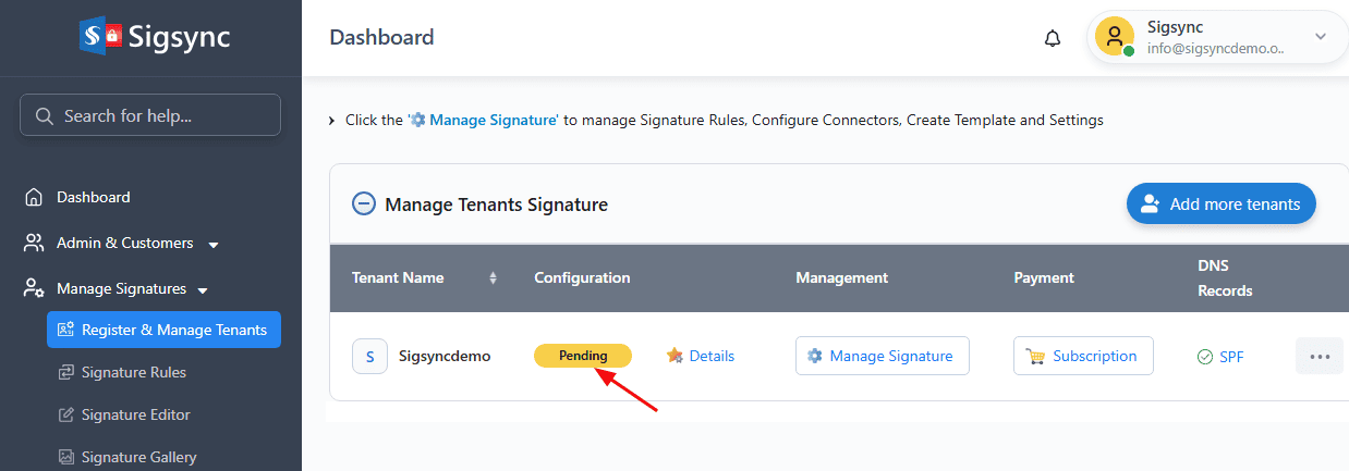To verify your tenant status, login to the Sigsync dashboard and verify if your tenant is visible in the list. If not, you have to register it. To register, click on the Add more tenants button and follow the steps to add a tenant.