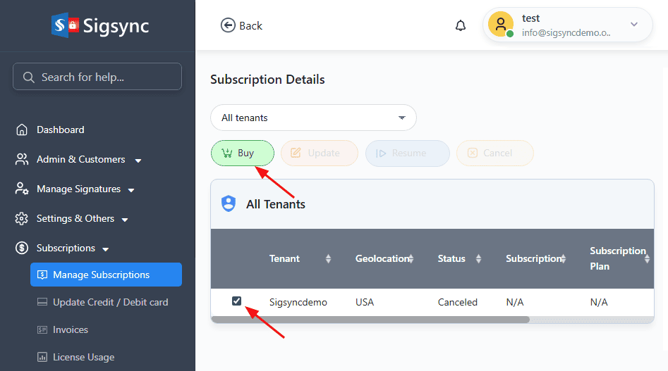 To check your subscription status login to Sigsync Dashboard and click on the 'Subscriptions' < 'Manage Subscriptions'. Select the Tenant and click the 'Buy' button to proceed with the renew subscription.You have exceeded the number of Sigsync licenses
