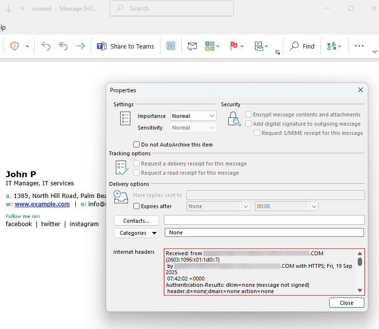 When a message has been opened in a new window, the internet headers can be seen by clicking the File -> Info -> Properties on the menu, or by clicking the expand button placed on the Message tab, in the lower-right corner of the Tags group. To do this, follow the steps below: