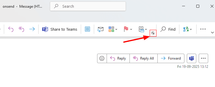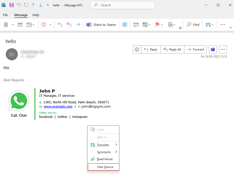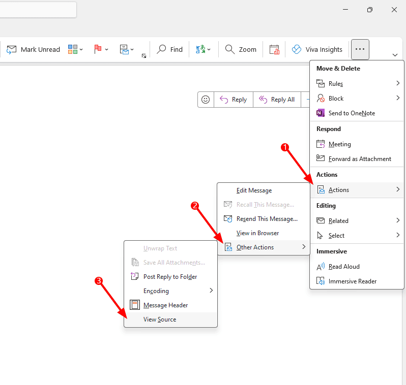 - In the Message section, go to Actions -> Other Actions -> View source as shown in the screenshot below.