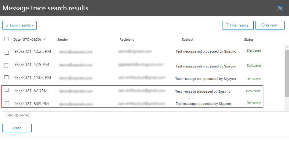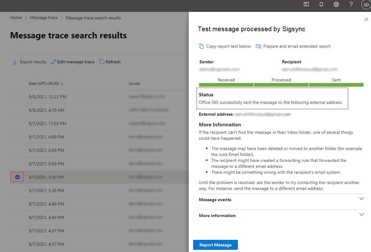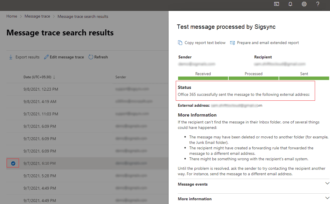Let’s understand the message trace report generated in the Microsoft 365 Security & Compliance centre. The test email appears twice on the Message trace, because the mail is first sent to the Sigsync Office 365 Azure service using the outbound connector, then it is being received back in Exchange Online through the inbound connector and finally sent to the recipient.