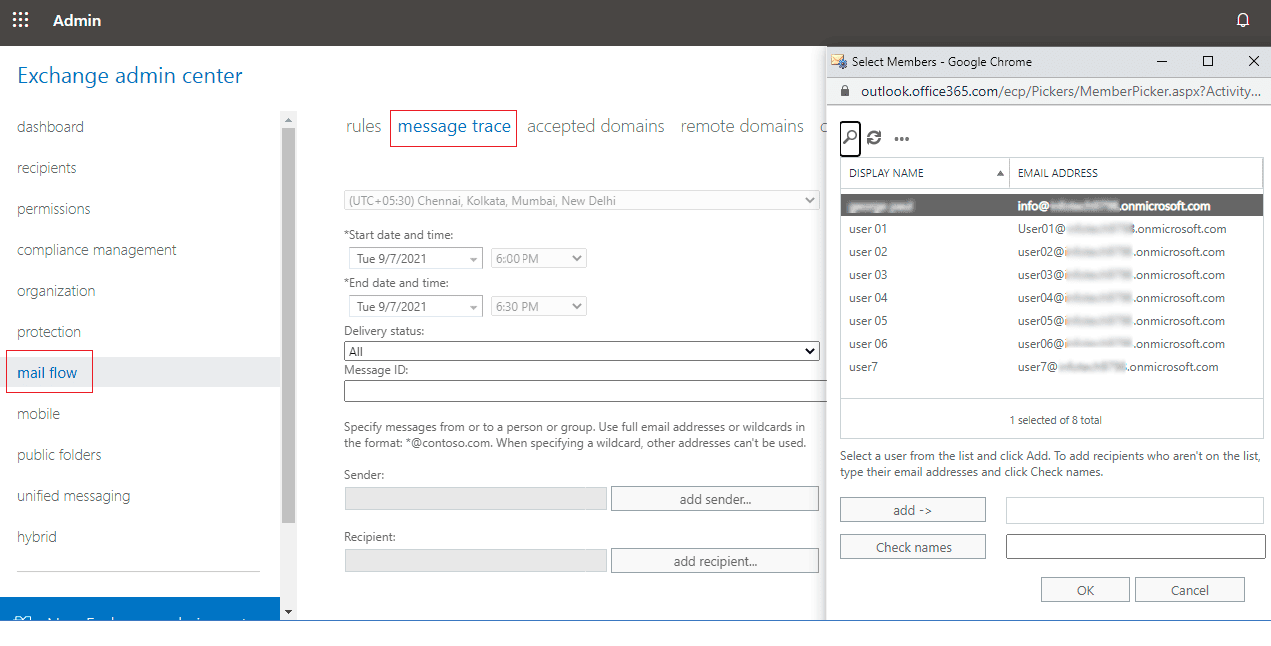 - Sign in to the Exchange admin center and navigate to Mail flow -> Message trace.
