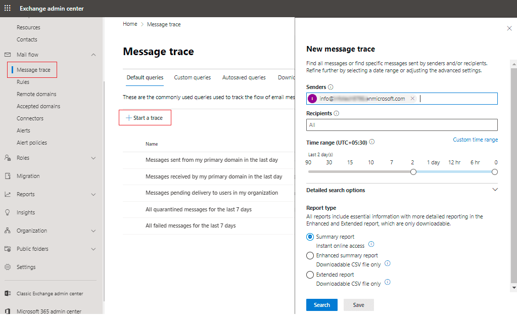 Steps to create a message trace report in the Exchange admin center (classic version)