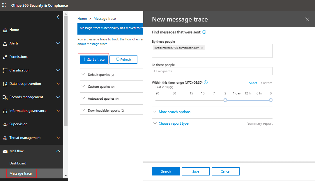 - Open the Office 365 Security & Compliance center and select Mail flow -> Message trace.