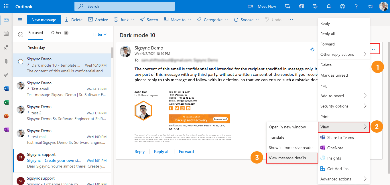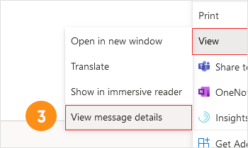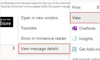 - Click on the ‘...’ (three dots) button in the upper-right corner of the reading pane and then navigate to View and click on the View message details.