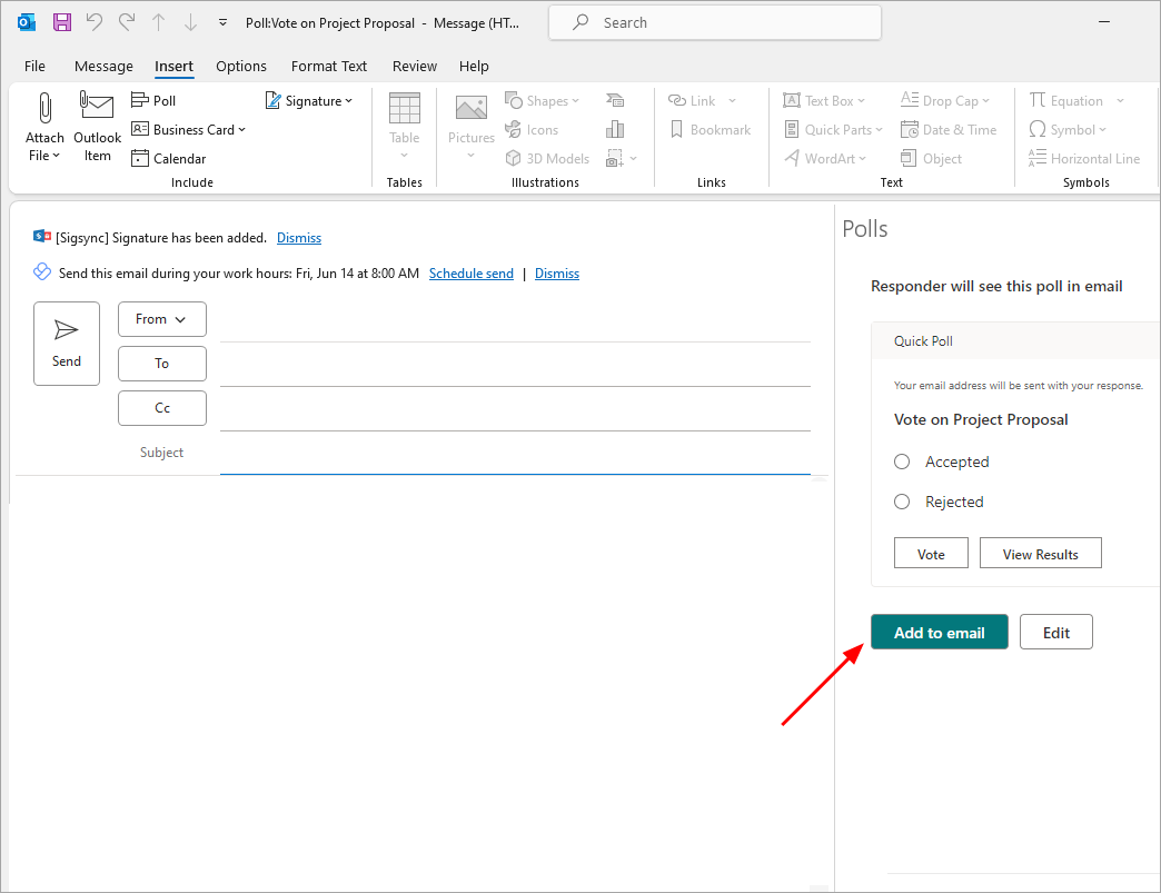 You can effortlessly use the 'Create Polls' feature in Outlook to include voting buttons in your emails. Click here for step-by-step instructions.
