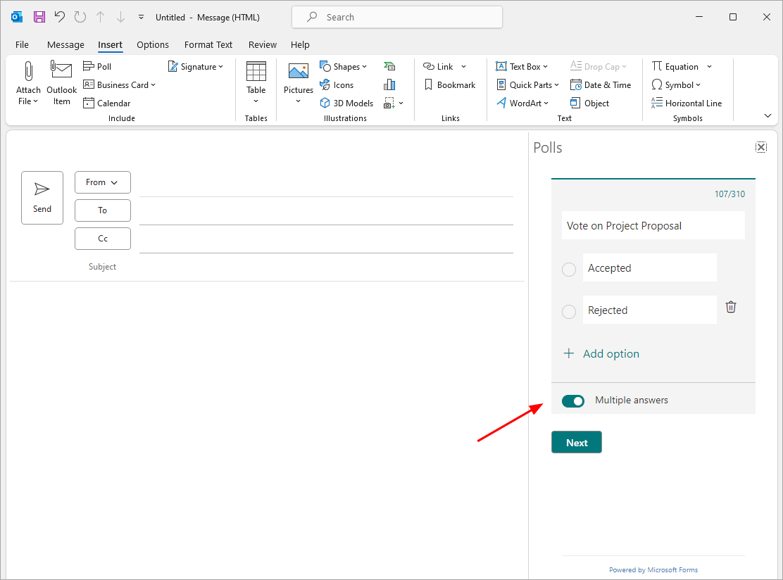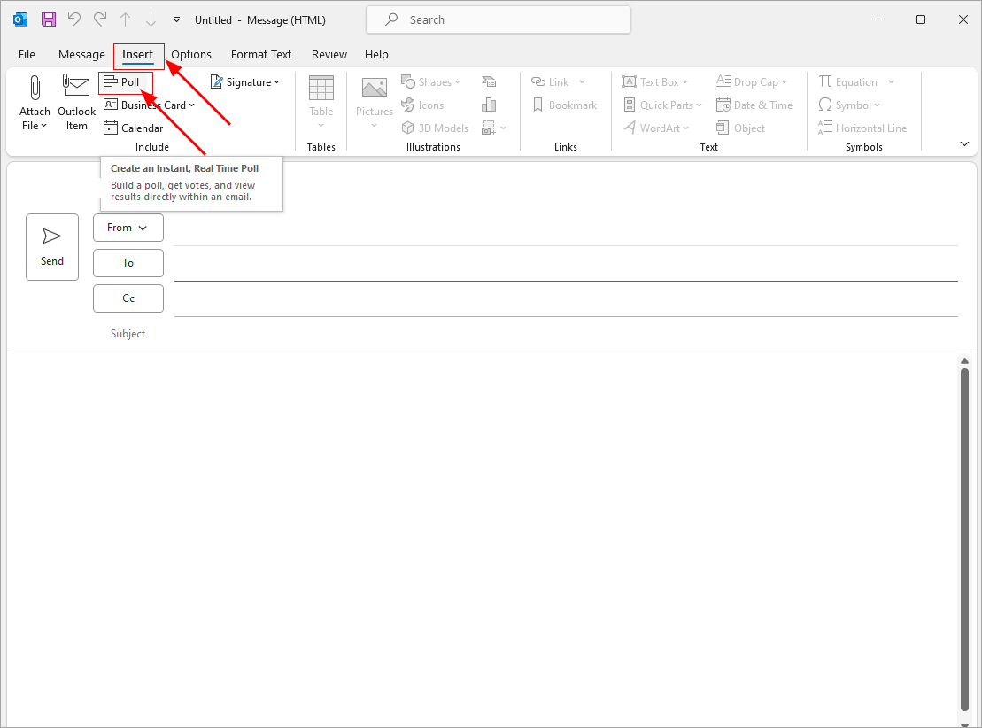 - Open the compose window on Outlook, then click the 'Insert' tab in the menu bar, followed by selecting 'Poll'