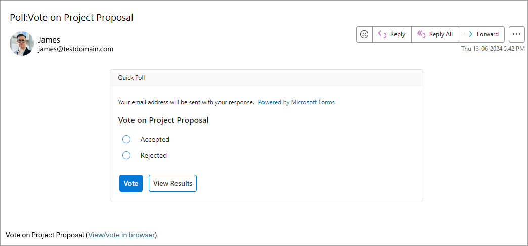 Your recipients will view the poll directly within the email body (also known as an ‘actionable message’) or receive a link via email to vote in a browser.